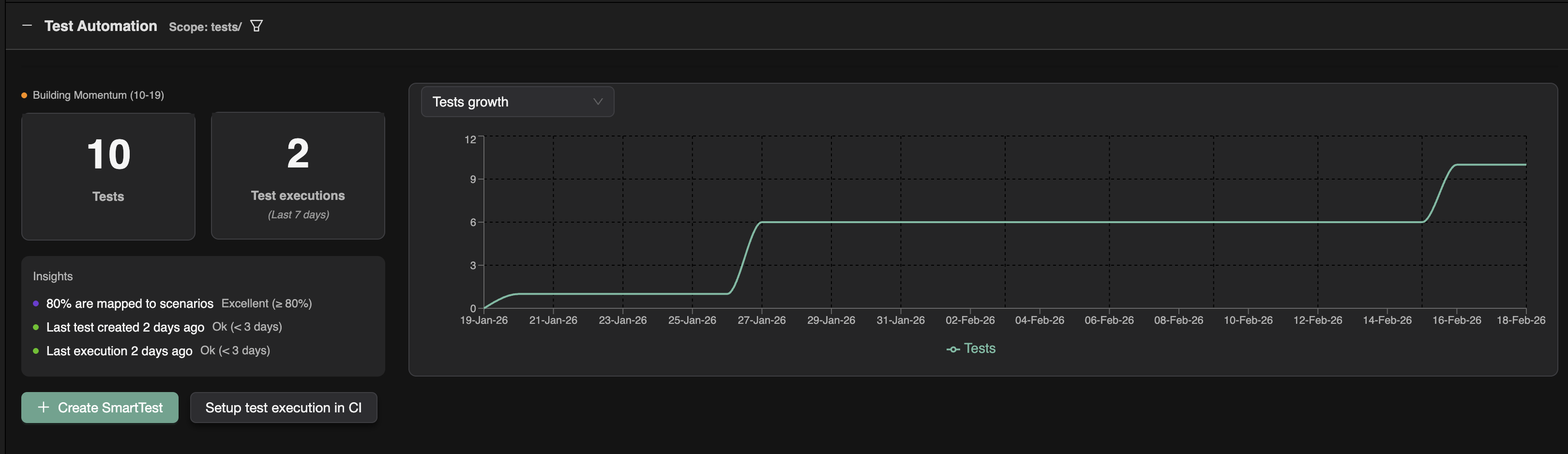 - Core metrics: Number of tests, number of executions, and key stats such as the percentage of tests with no scenarios linked.