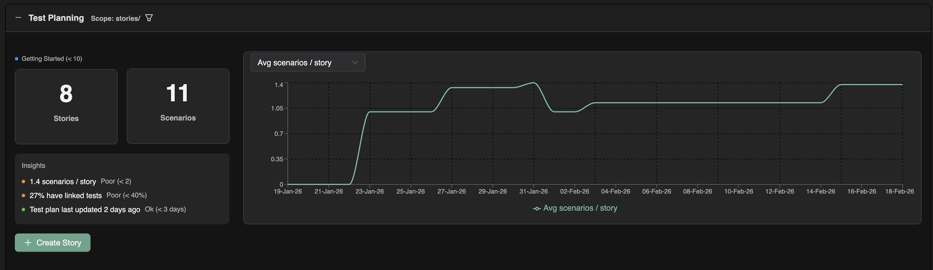 - Core metrics: Number of stories, number of scenarios, average scenarios per story, percentage of scenarios with linked tests, and related stats.