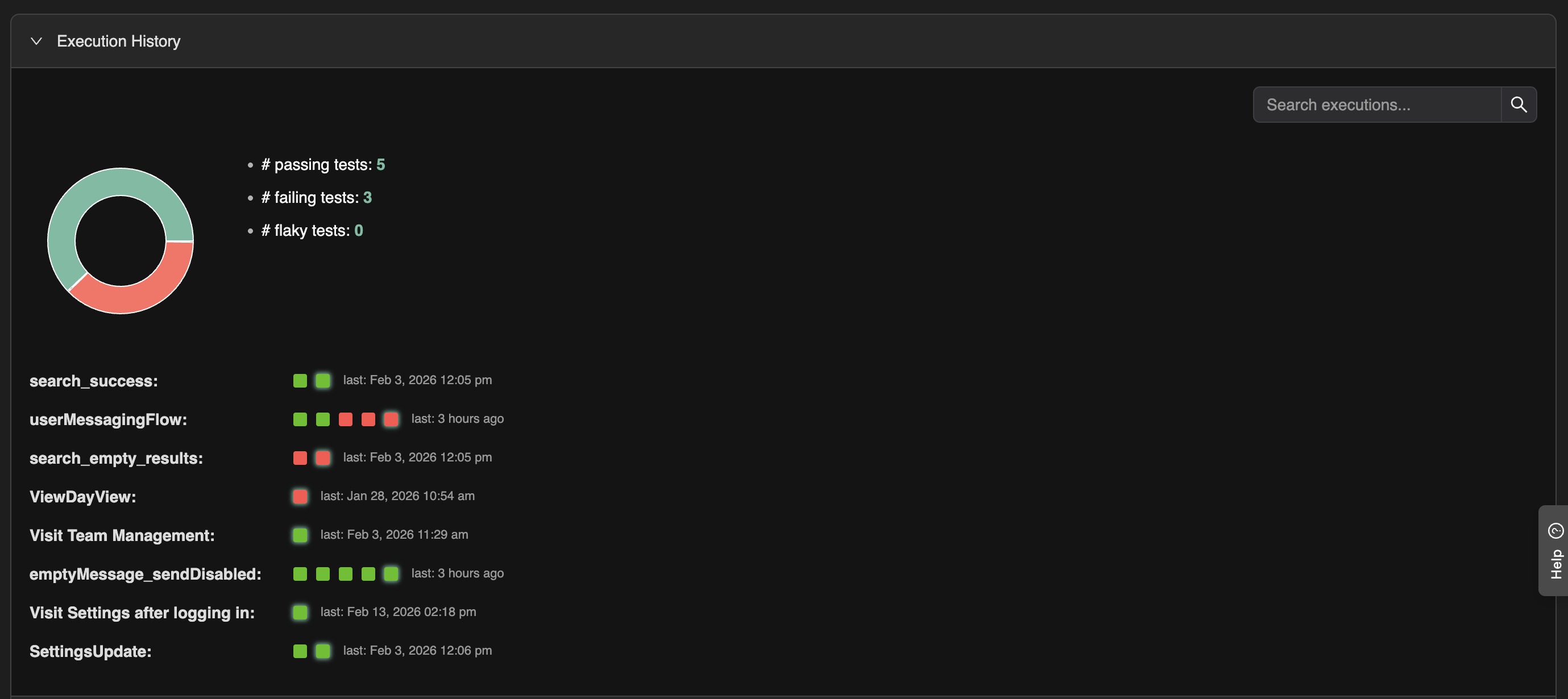 Execution history shows when tests in the selected scope were run and the outcome of each run. A pass/fail summary (e.g. pie chart) gives a quick view of stability and success rate for that scope.