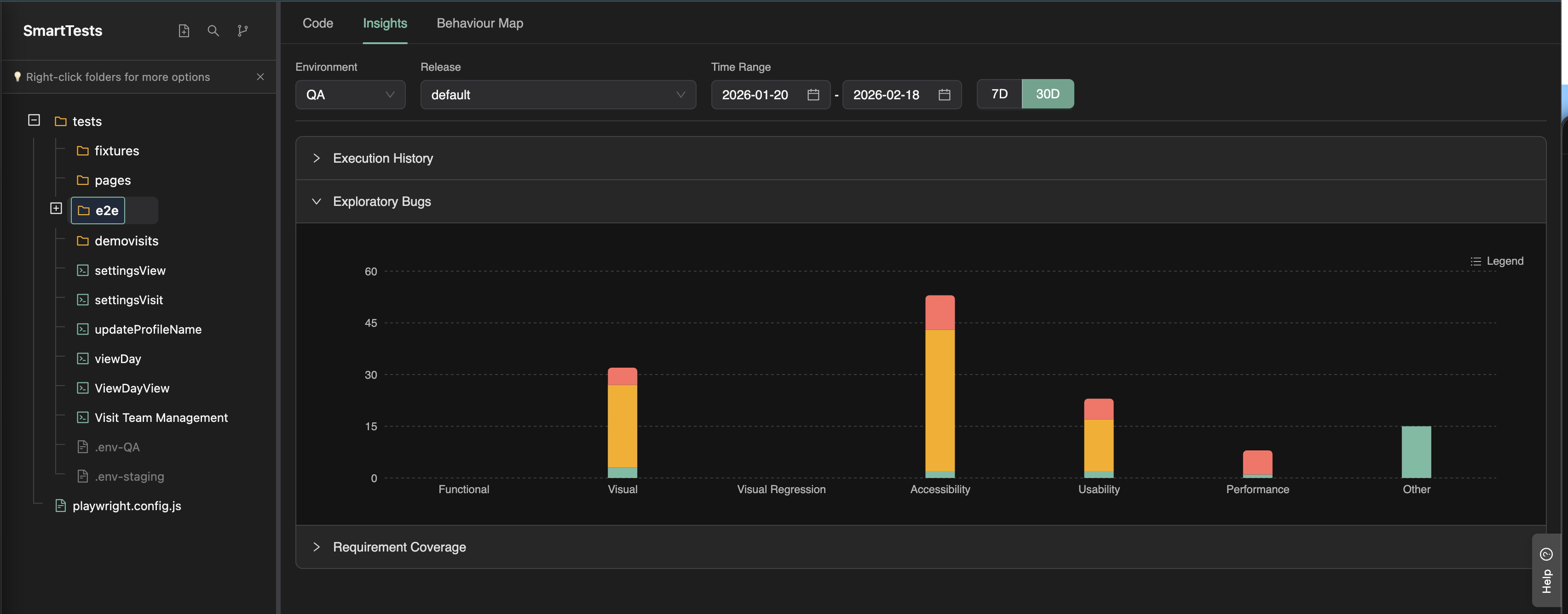 The Insights tab also shows a summary of exploratory bug findings from agentic walks that used tests within the selected scope. This ties exploratory discovery directly to the same tests and folders you're viewing.